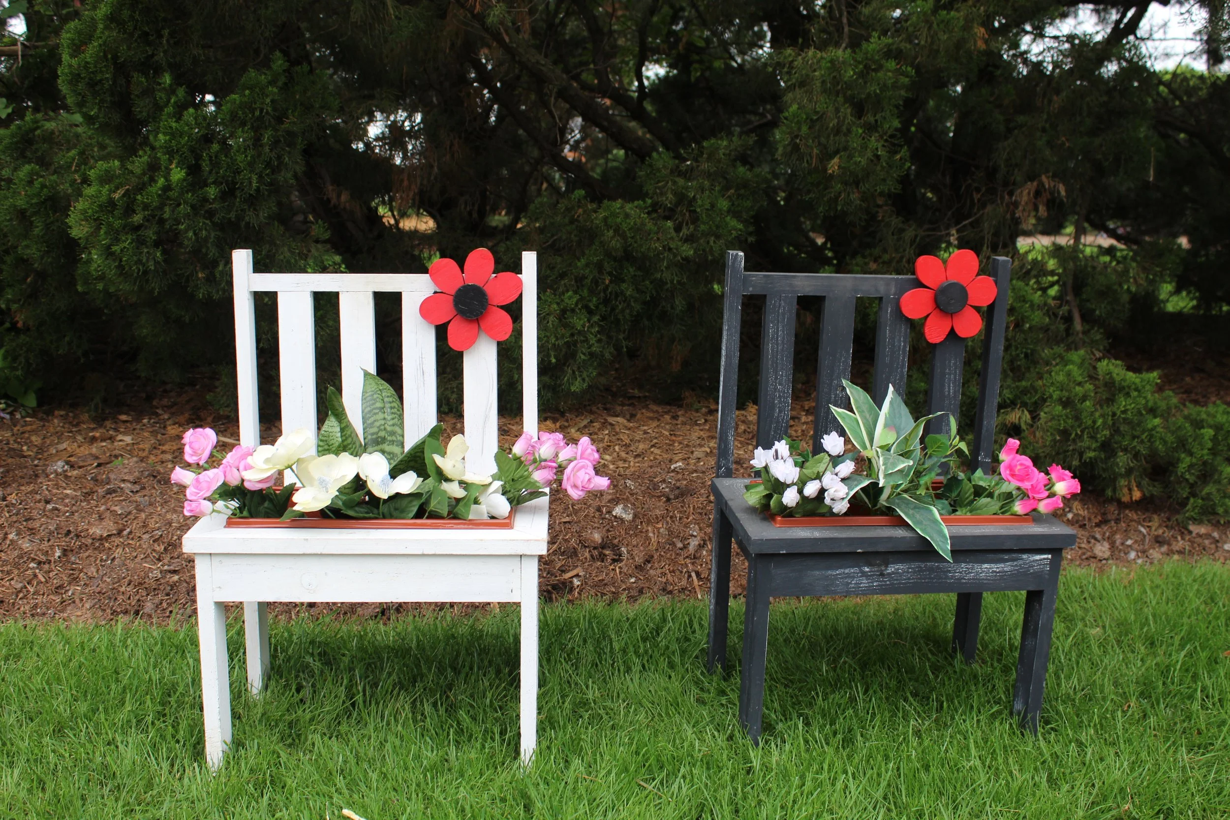 Our planter benches are constructed of white pine boards. They have a plastic planter pot ready for flowers, pumpkins, or Christmas wreaths. They’re painted in antique black or white.