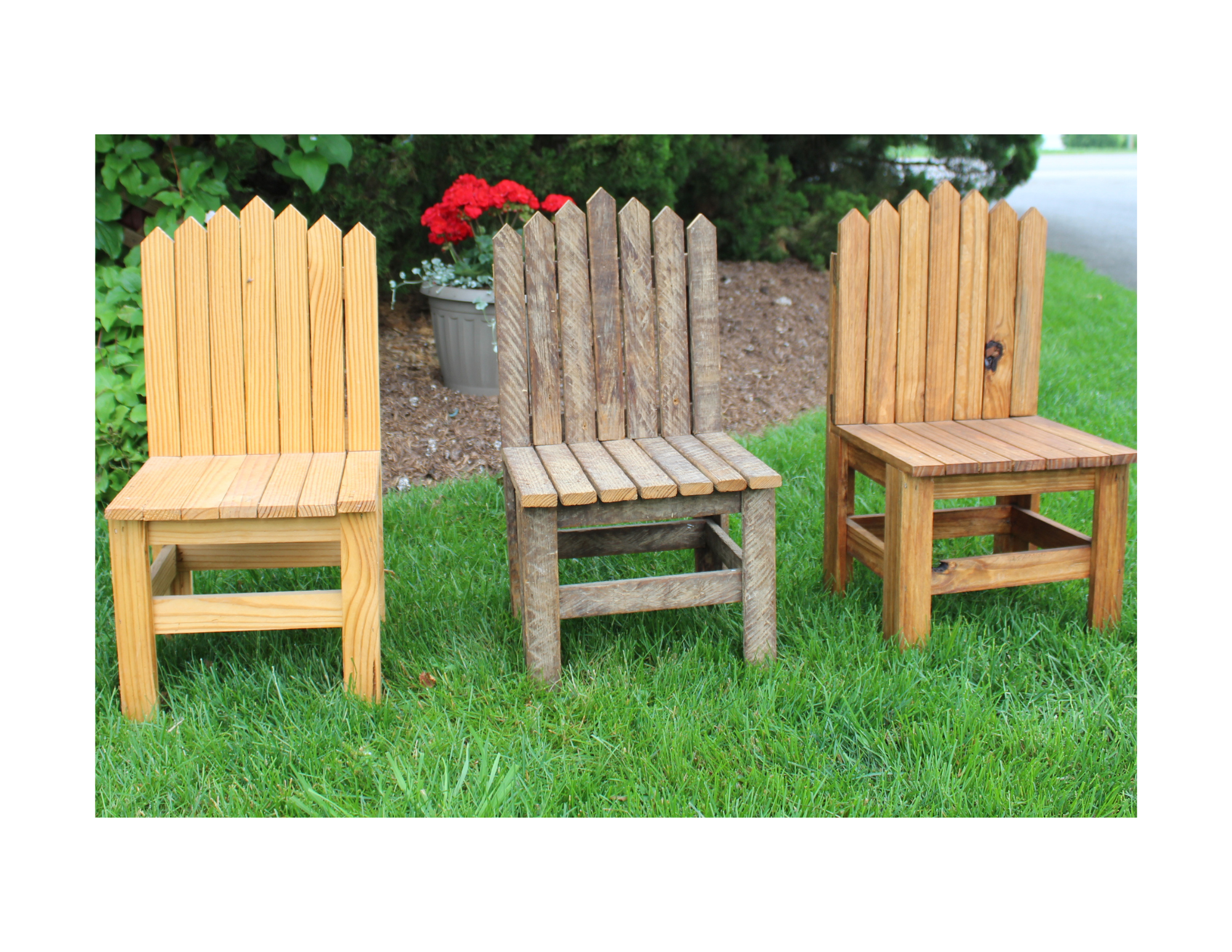 Our little benches and chairs are constructed of yellow pine lathes. They are carefully built in our shop in Lancaster County, then clear-coated or stained with a high-quality rustic exterior stain.